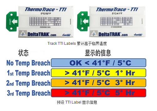 DeltaTrak 的冷藏鏈解決方案包括 ThermoTrace TTI 標(biāo)簽和 ThermoTrace TTI 服務(wù)。TTI 標(biāo)簽是一個(gè)低成本的一次性的條碼標(biāo)簽,,支持各種預(yù)定的時(shí)間和溫度;隍(yàn)證的 (無毒) 化學(xué)過程,,條碼會(huì)由跟蹤三個(gè)不同水平的溫度變化累積而改變。這個(gè)動(dòng)態(tài)過程在每次條碼掃描時(shí)被實(shí)時(shí)地記錄。 購買標(biāo)簽,但沒有訂購 ThermoTrace TTI 服務(wù)的客戶只會(huì)收到掃描儀上預(yù)先配置的反饋消息。也不會(huì)收到通過電子郵件或短信文本的任何警報(bào)消息。 DeltaTrak 目前提供兩個(gè)標(biāo)簽型號。型號 55100 0 ° C 臨界溫度和型號 55101 臨界溫度 5 ° C 。 標(biāo)簽的設(shè)計(jì)旨在改變條碼讀數(shù)當(dāng)三個(gè)不同累計(jì)溫度發(fā)生變化時(shí)。在任何時(shí)間點(diǎn)有只有一個(gè)有效的條碼。 對于 0 ° C 臨界點(diǎn)標(biāo)簽,,第一次改變發(fā)生時(shí)產(chǎn)品應(yīng)該已經(jīng)經(jīng)歷了 2 小時(shí)以上的 0 ° C,,第二次在 4 小時(shí)和 最后6 小時(shí)的變化。此標(biāo)簽通常會(huì)用于冷凍的商品,,如肉類、 海鮮或要求低溫儲存的雞。 臨界溫度 5 ° C 的標(biāo)簽跟蹤在產(chǎn)品經(jīng)歷高于5 ° C 的累計(jì)時(shí)間。 標(biāo)簽條形碼第一次在1 個(gè)小時(shí)后改變,,其后,,在 3 個(gè)小時(shí)和最終 5 小時(shí)。 此標(biāo)簽通常用于的商品包括貨物、 化學(xué)品或能承受稍高溫度的藥品等。