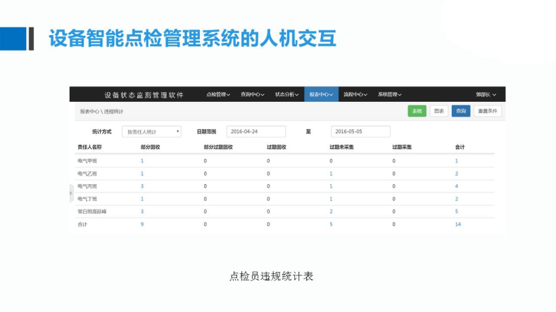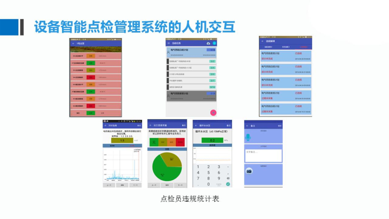 計劃點檢、臨時點檢、違規(guī)解釋、違規(guī)統(tǒng)計、生成計劃、狀態(tài)統(tǒng)計、任務交接